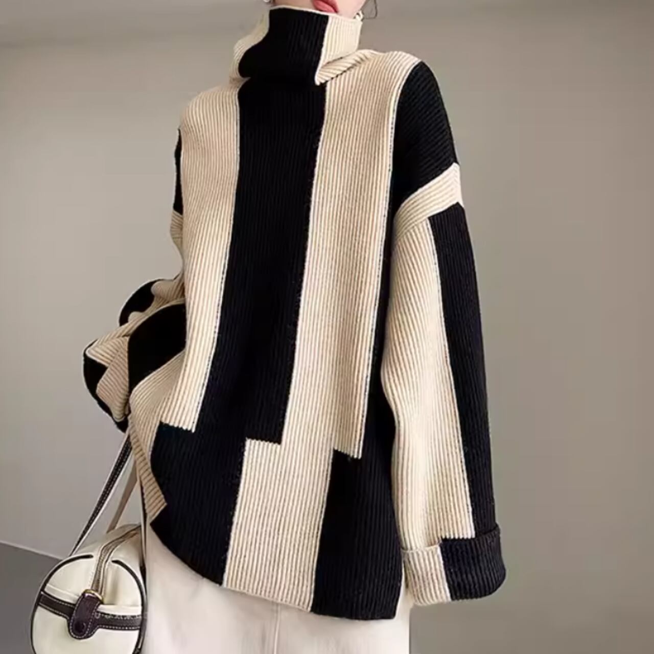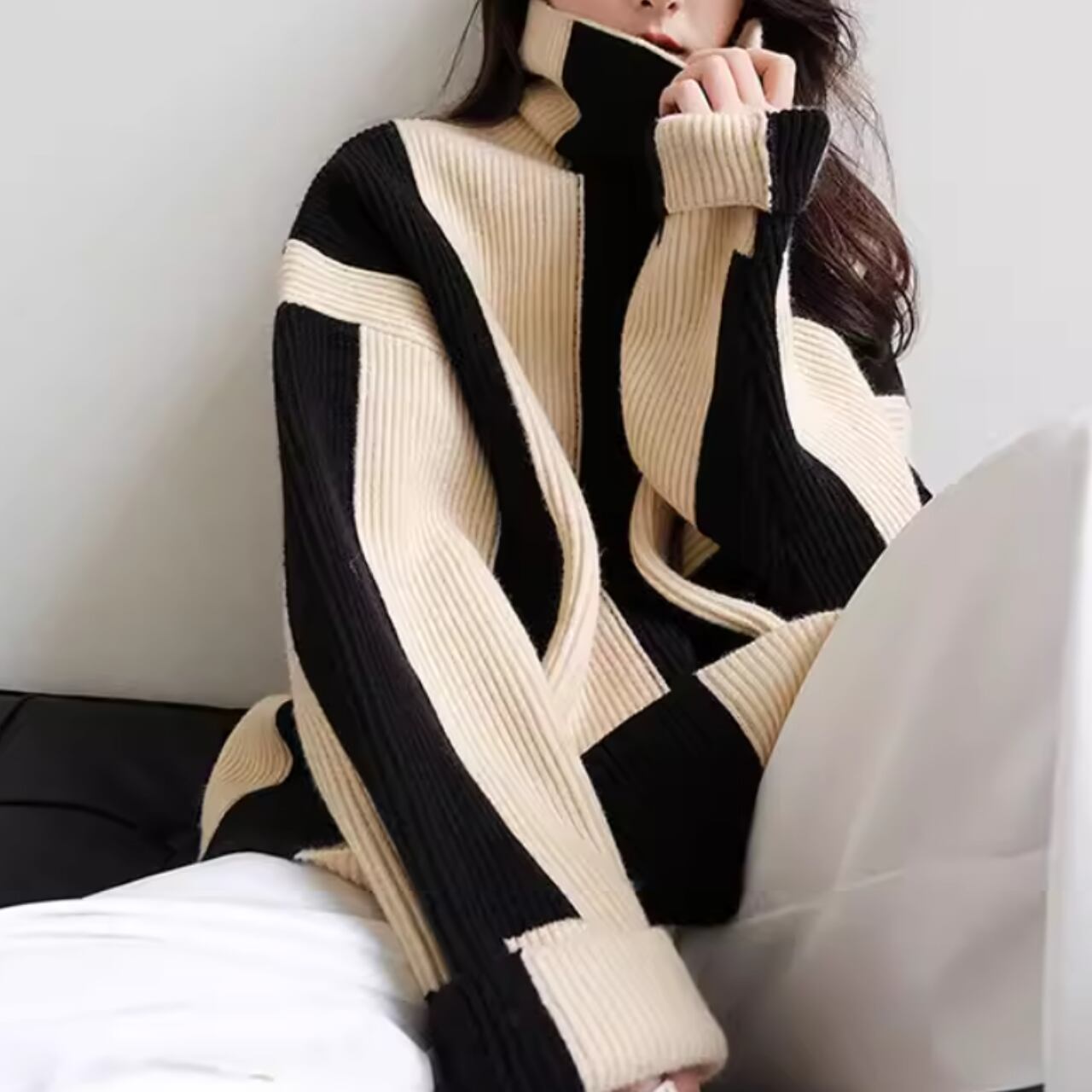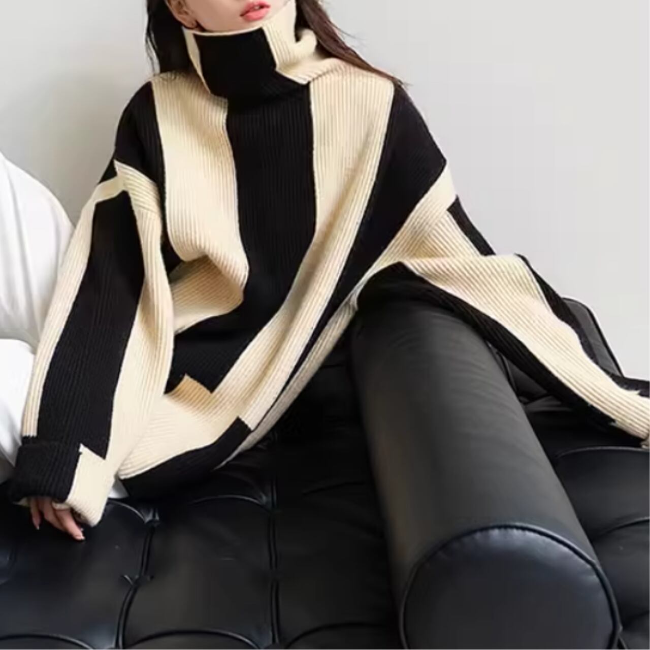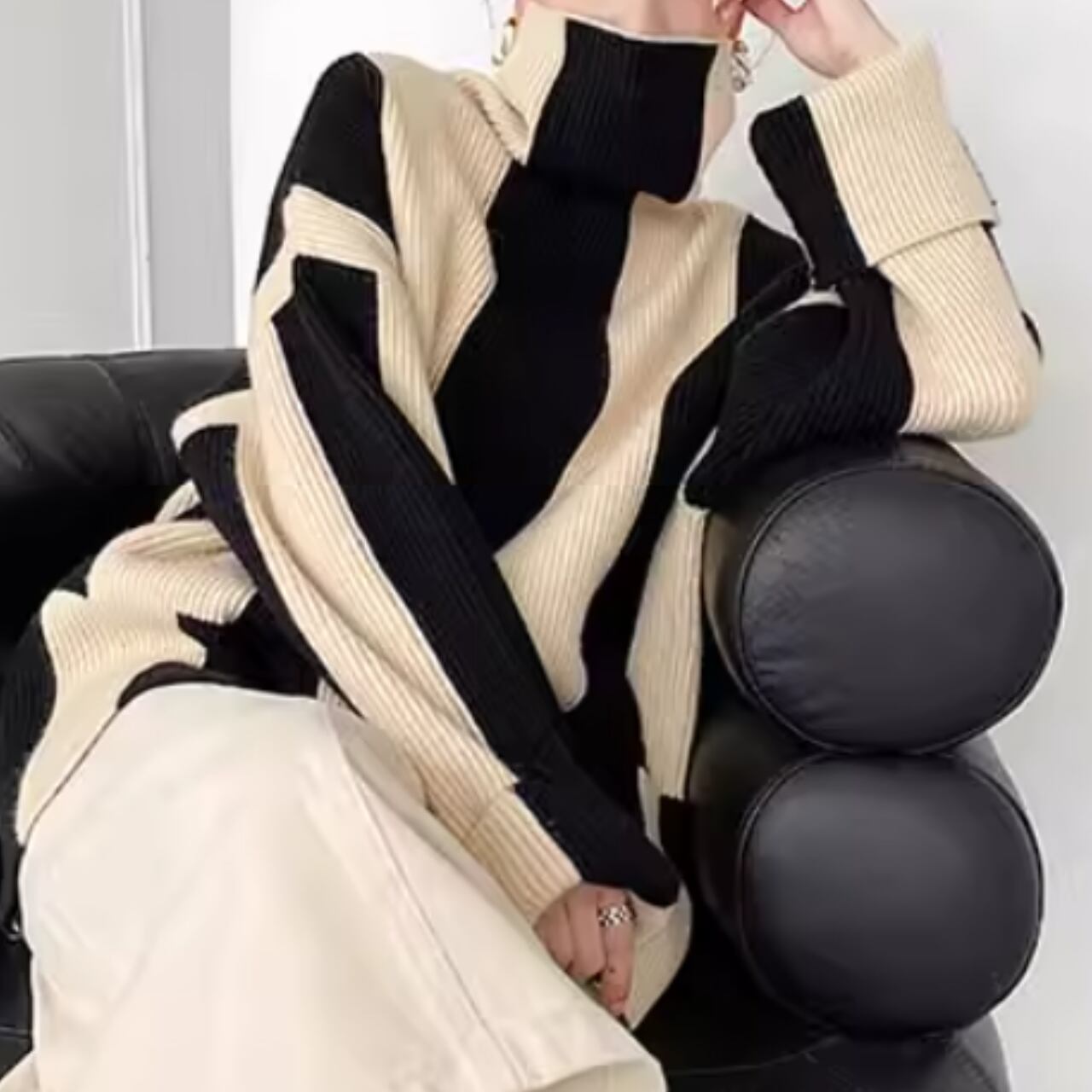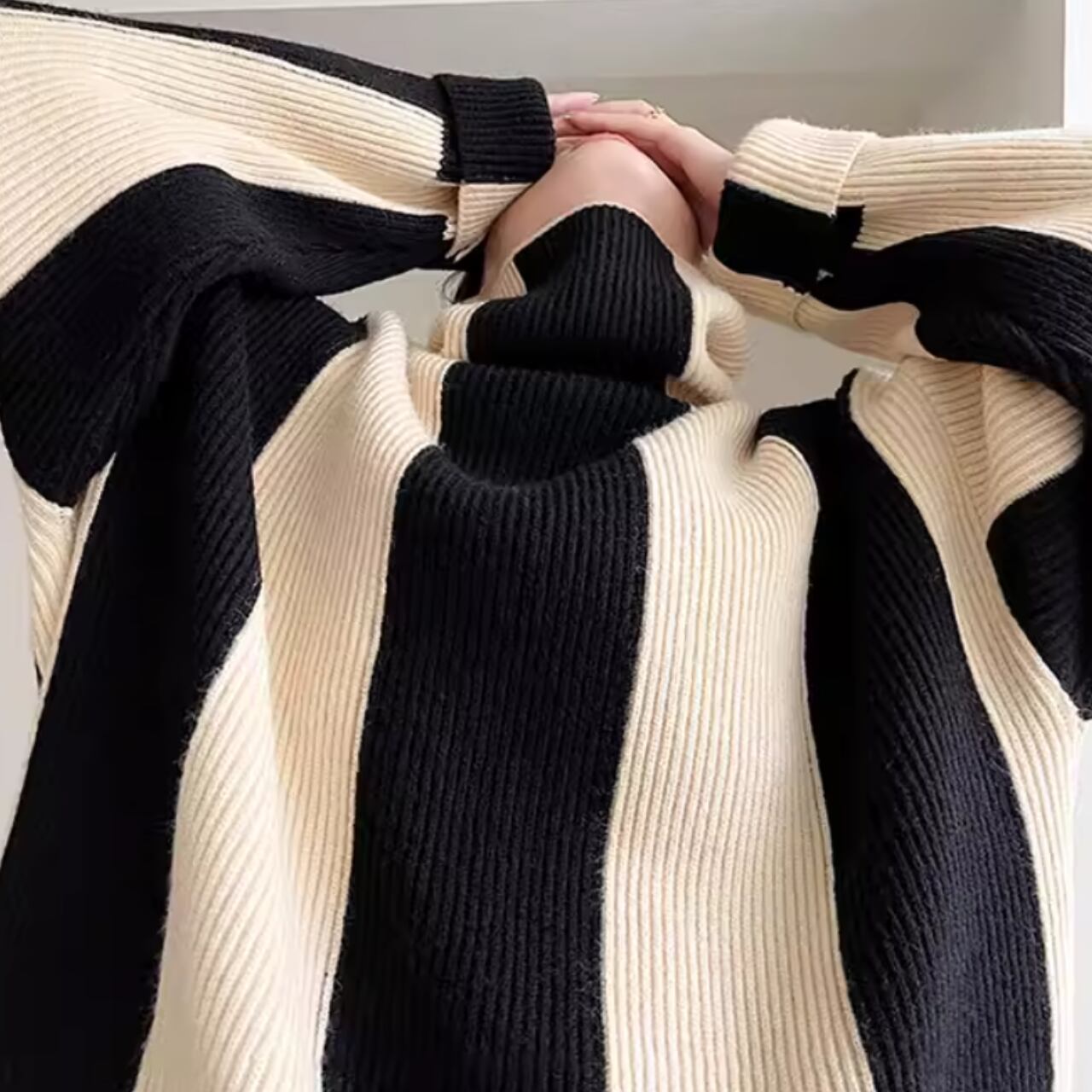 バイカラーストライプ ハイネックニットプルオーバー T-010