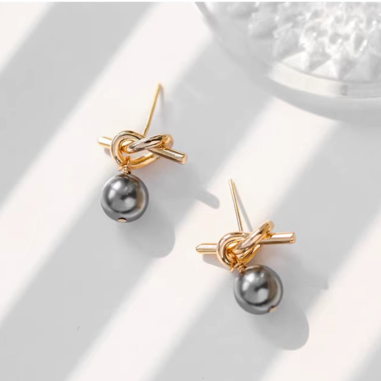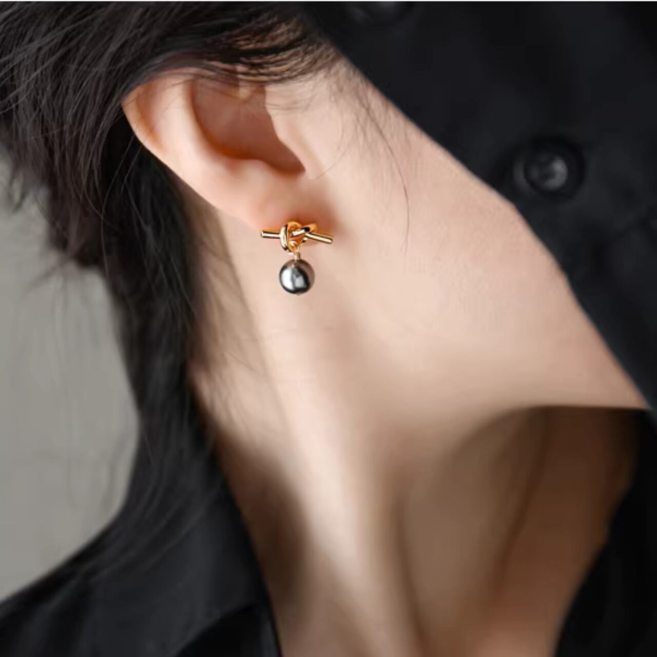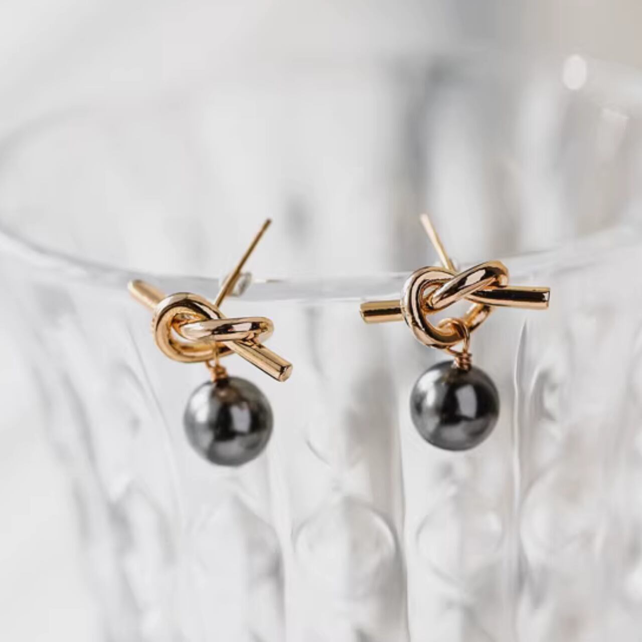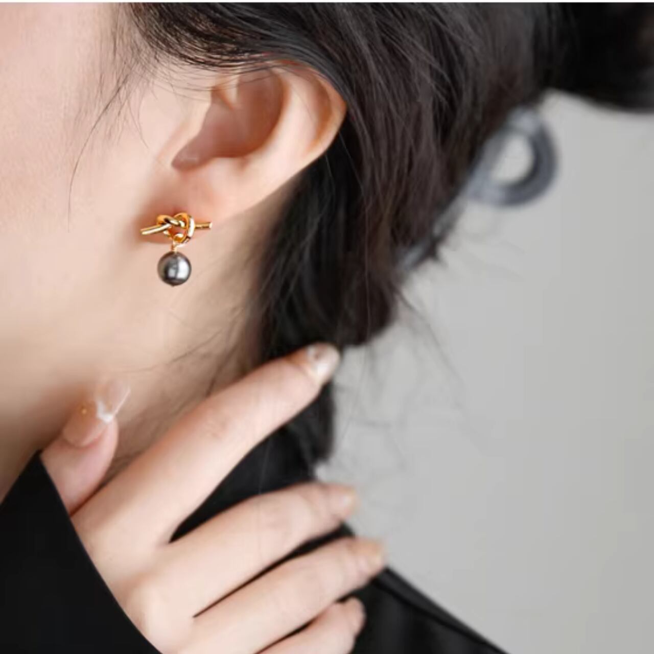 結びデザイン ブラックパール ピアス A-005