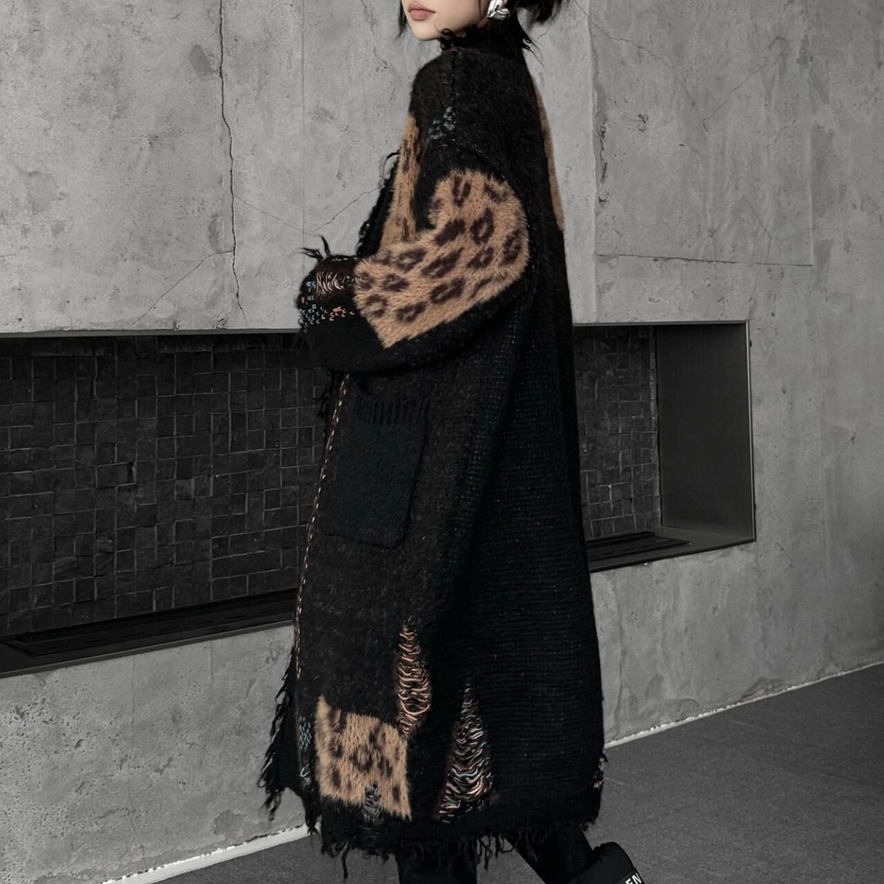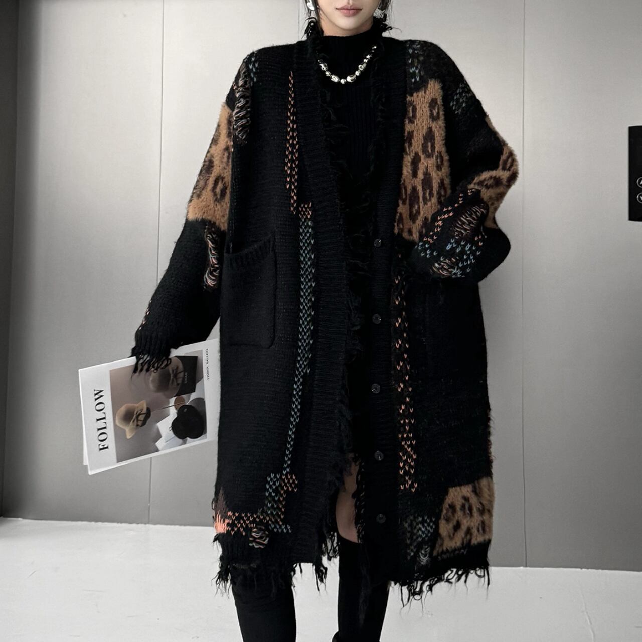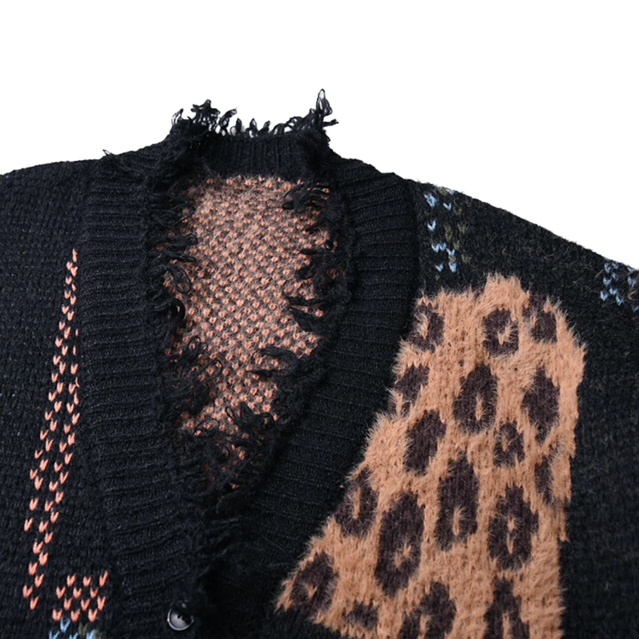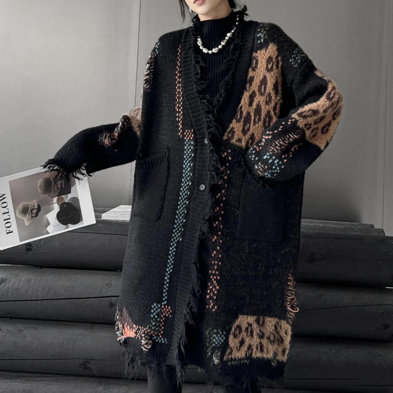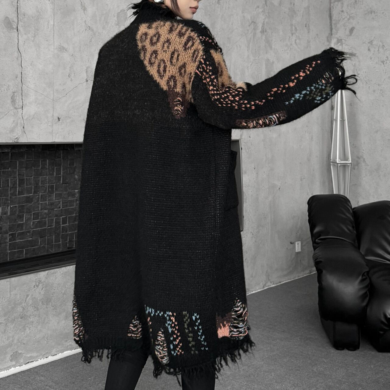 レオパード切替 ロングニットカーディガン O-009