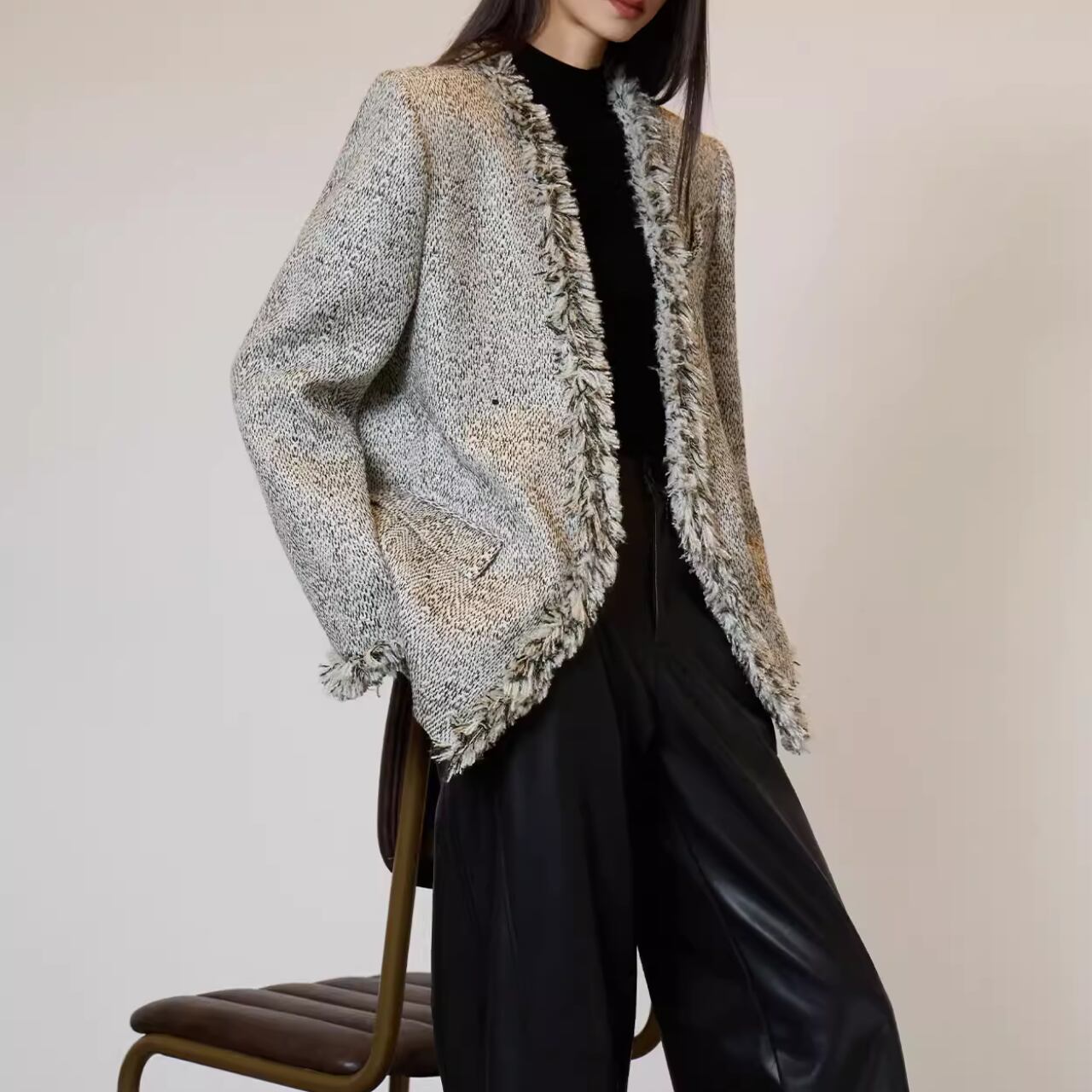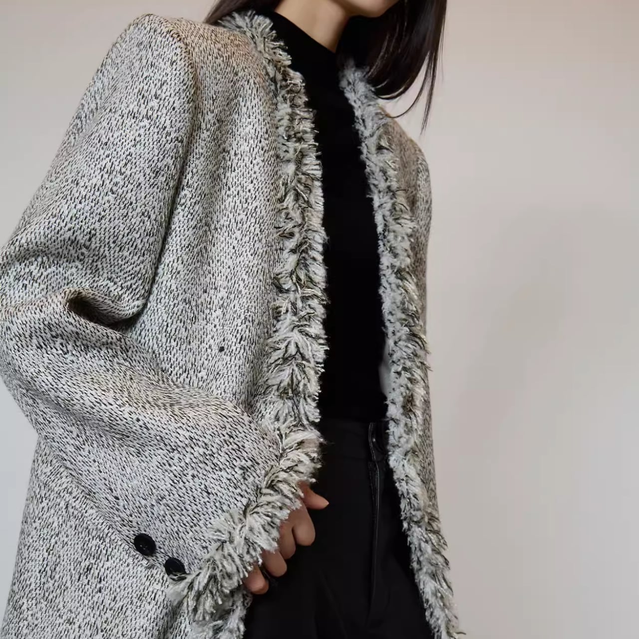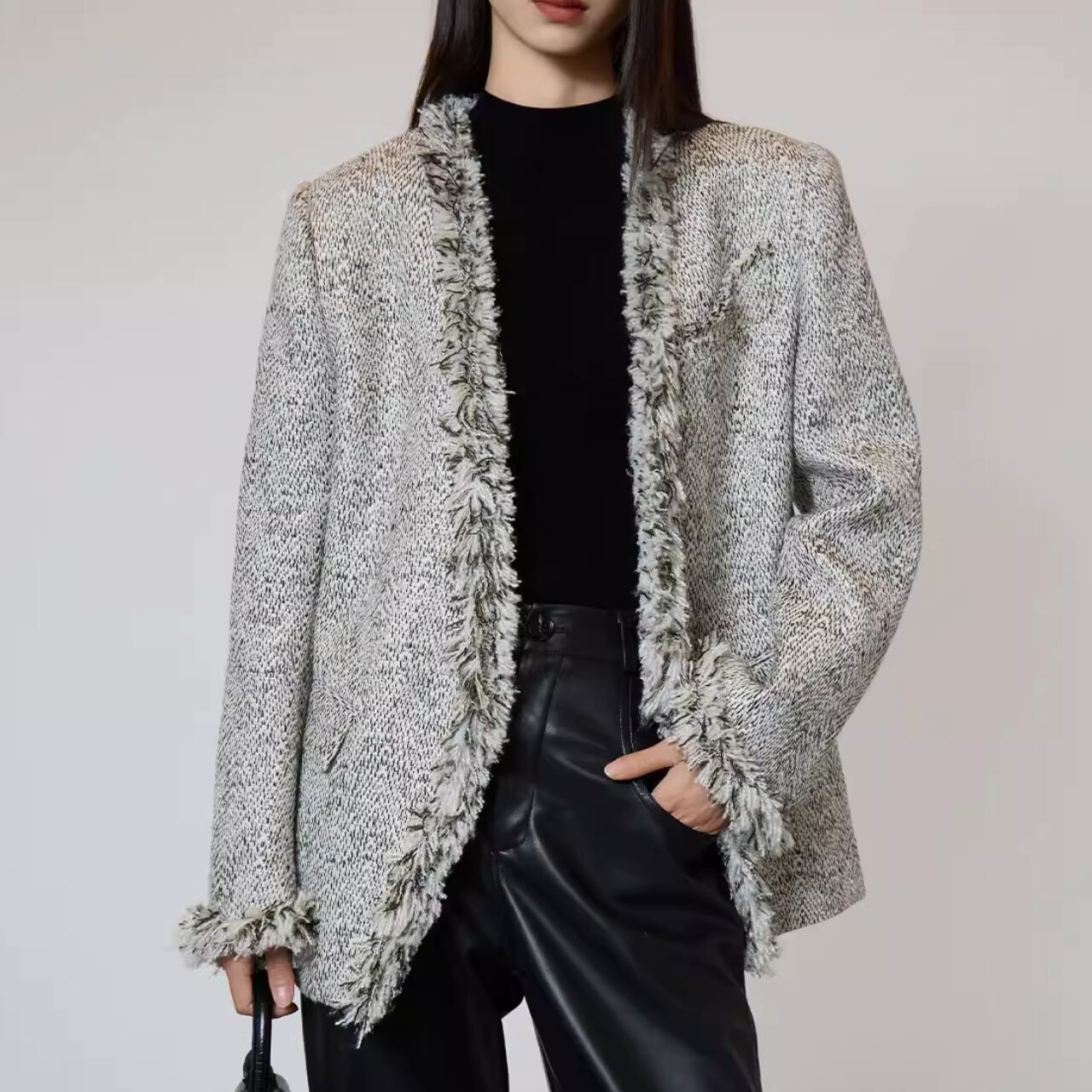 フレンチシック 起毛ツイード ノーカラージャケット O-010