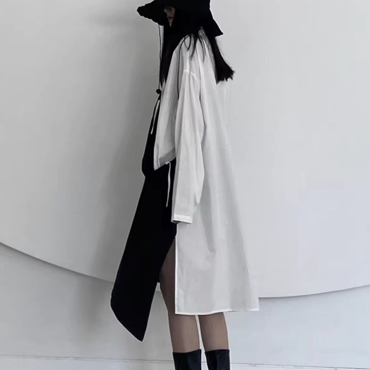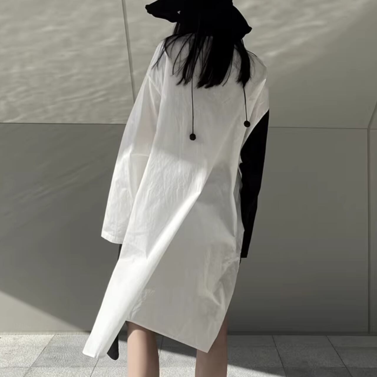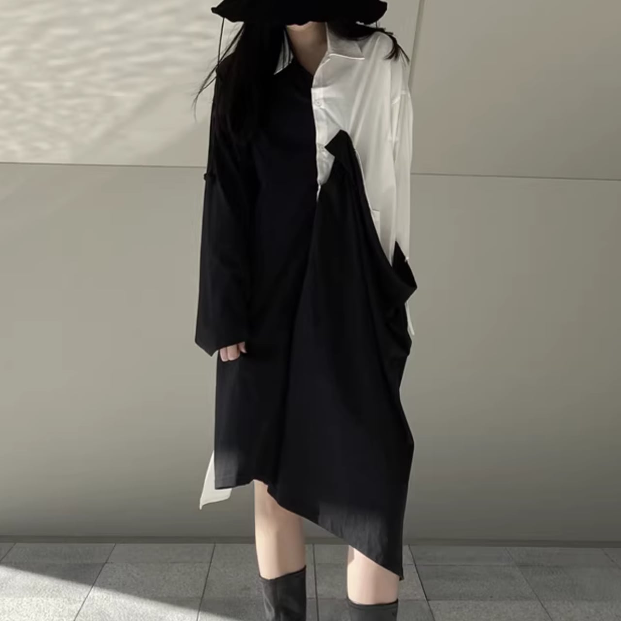 ブラック×ホワイト 配色切替 シャツレイヤード風ワンピース S-002