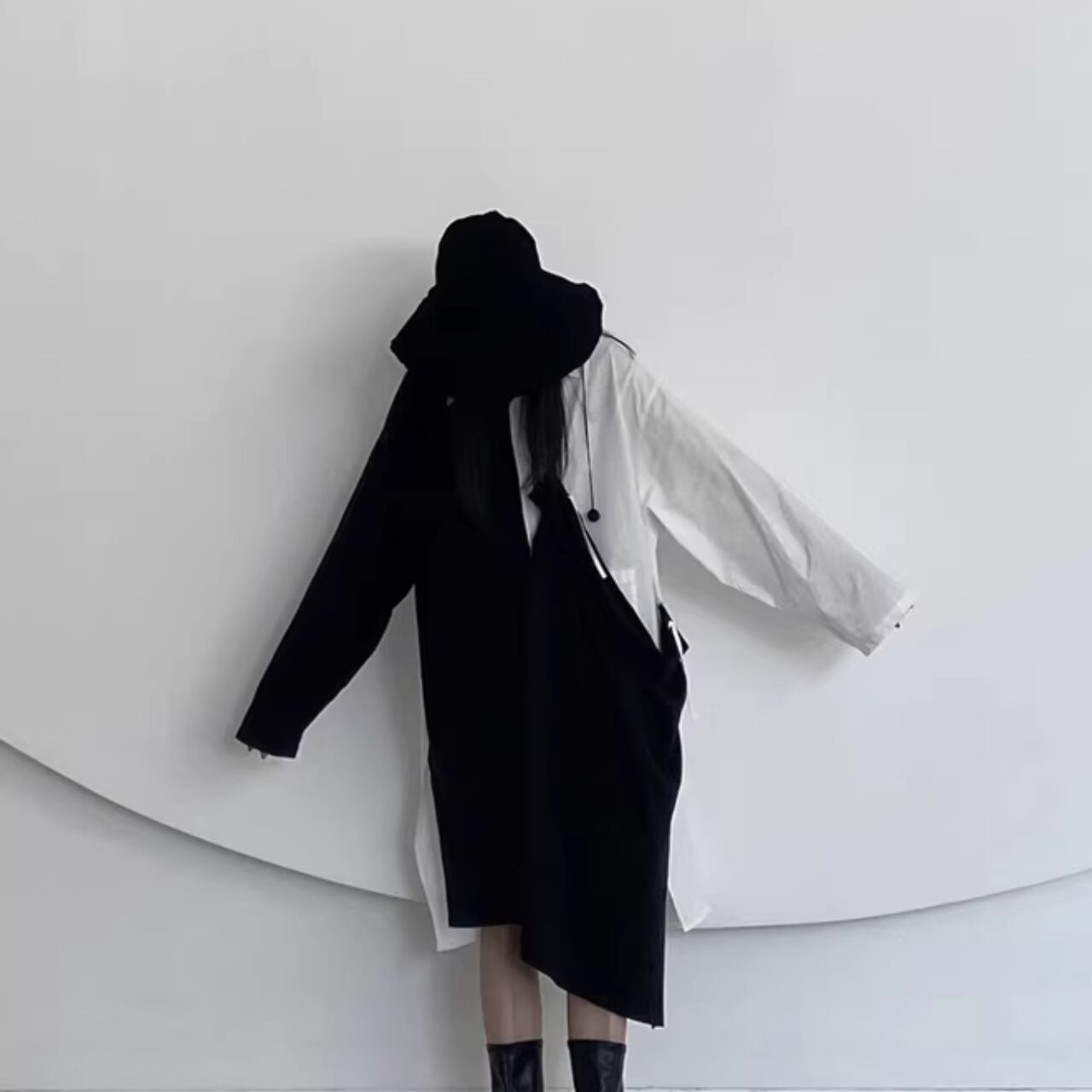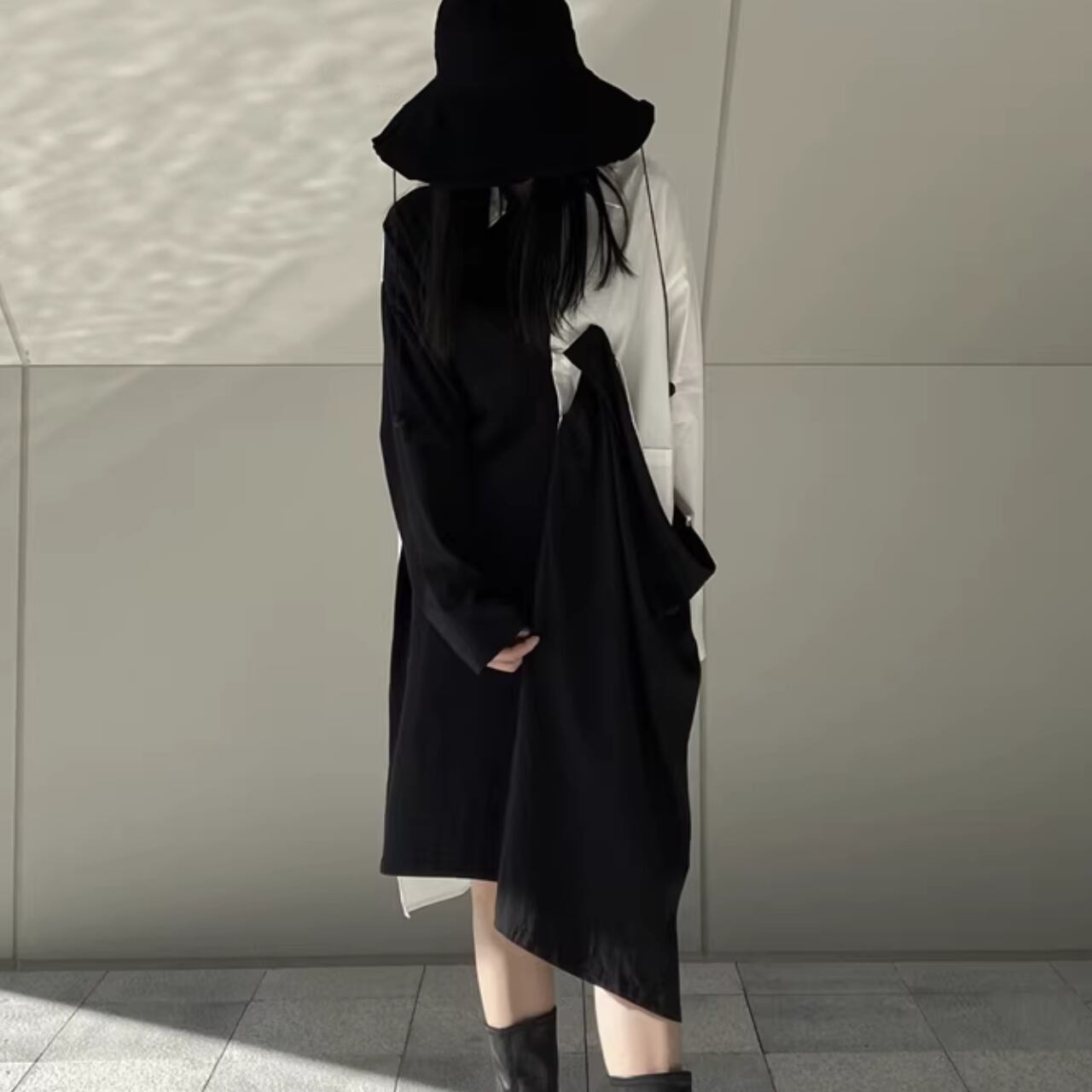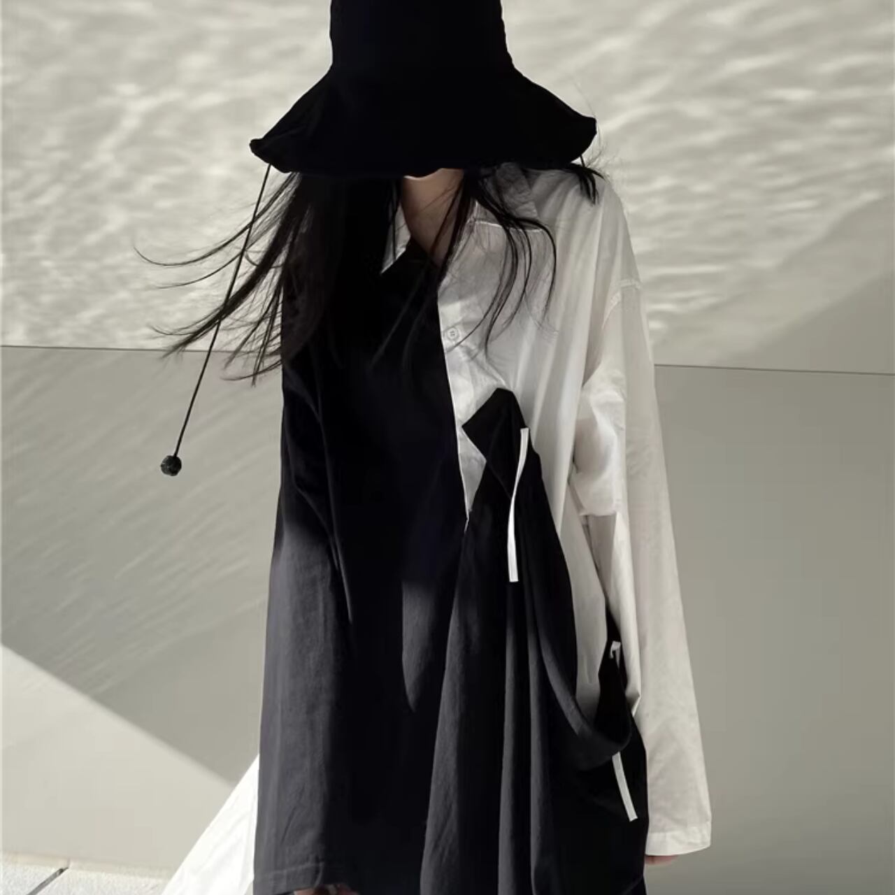 ブラック×ホワイト 配色切替 シャツレイヤード風ワンピース S-002