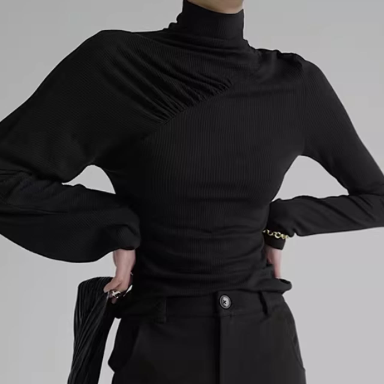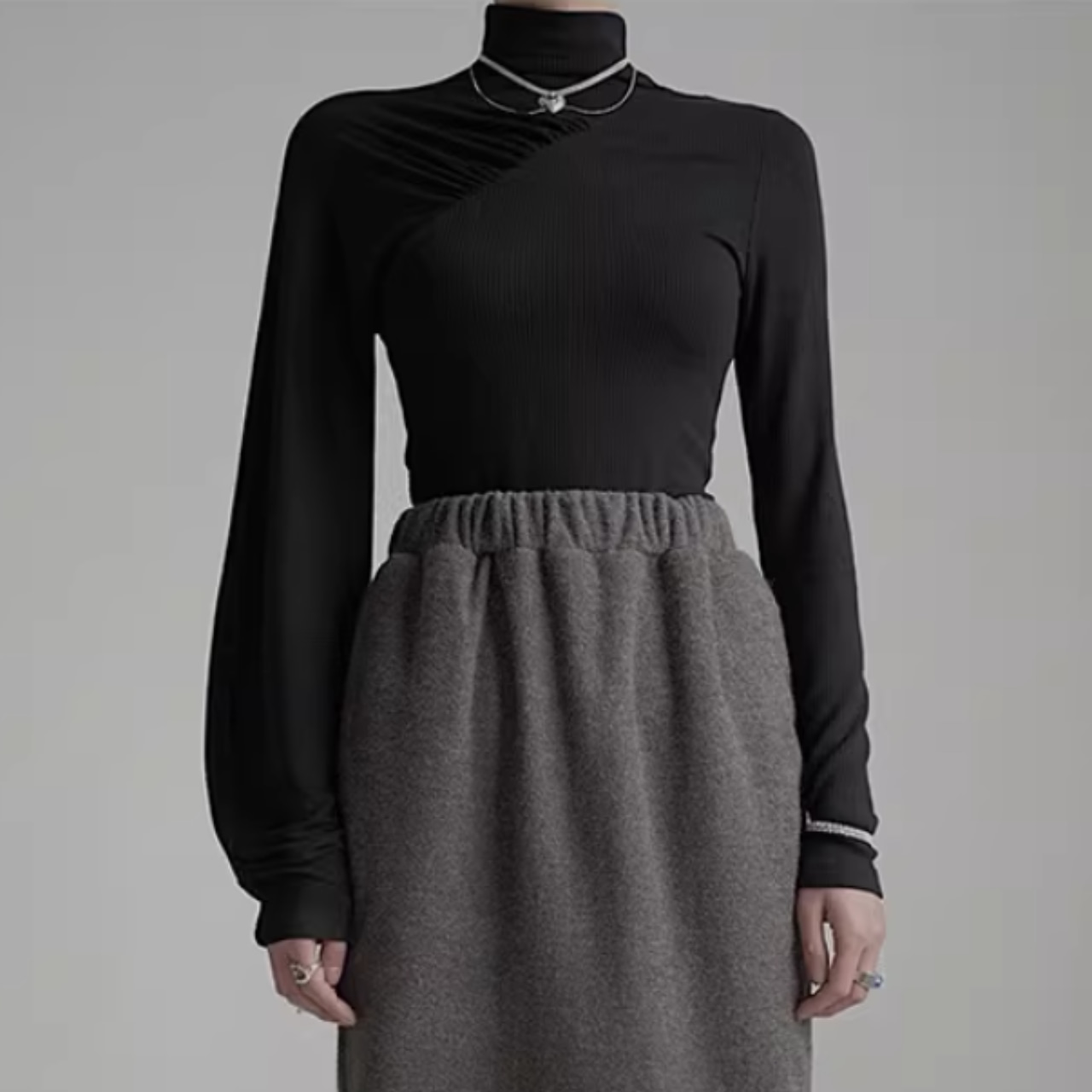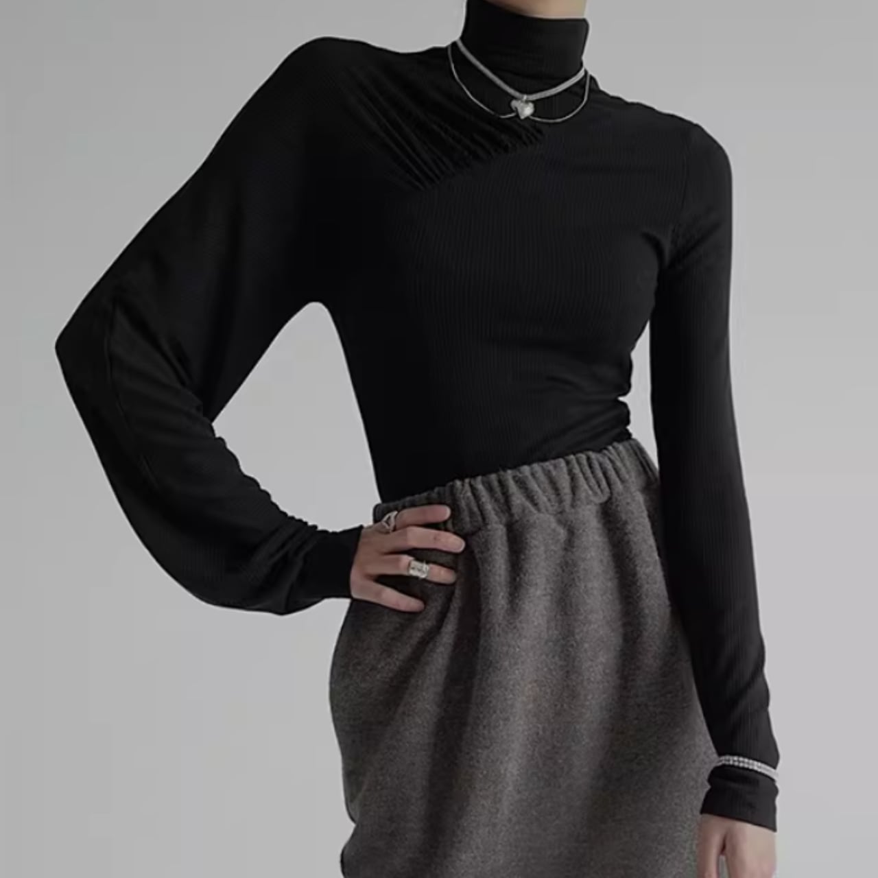 アシンメトリーギャザー タートルネックリブトップス WA0060