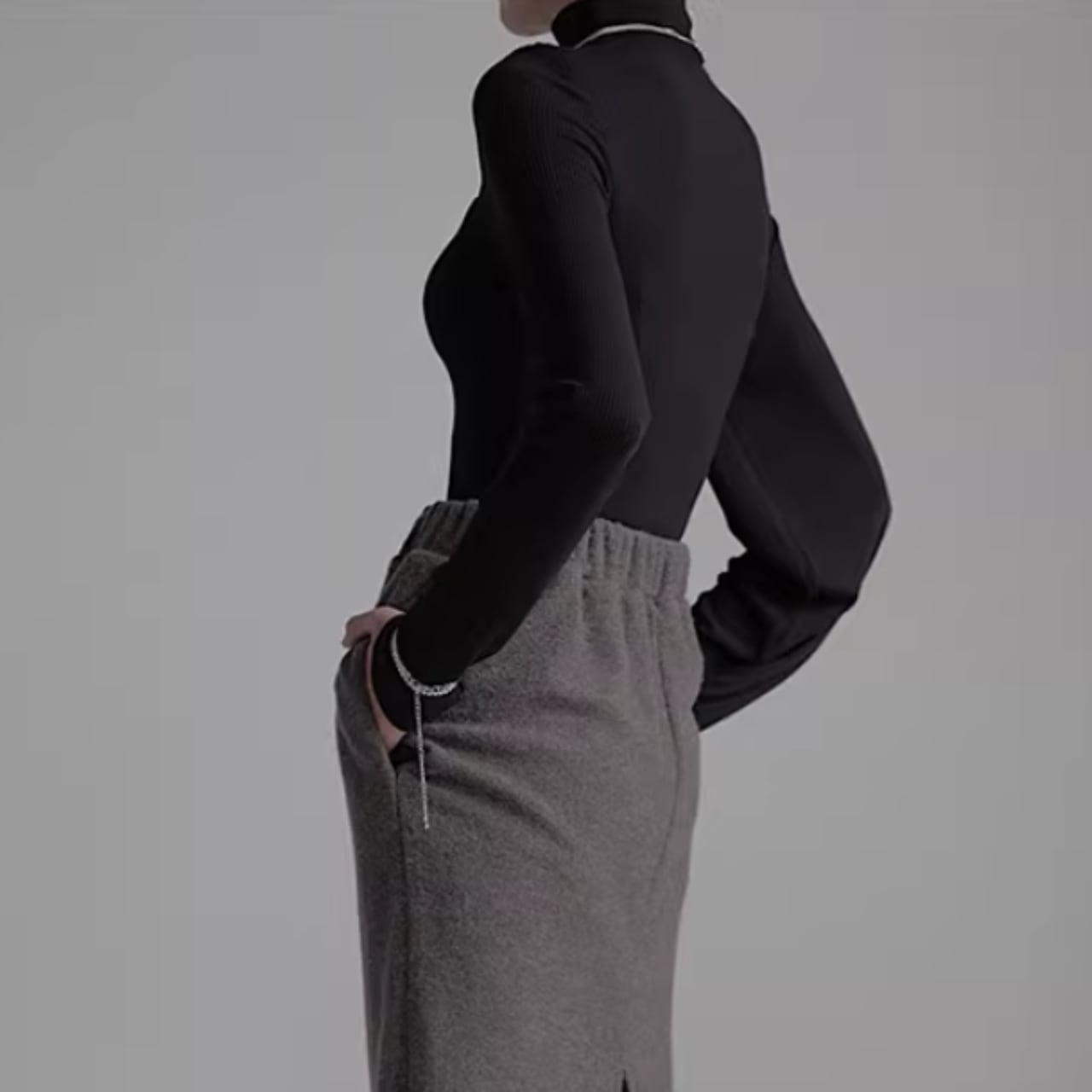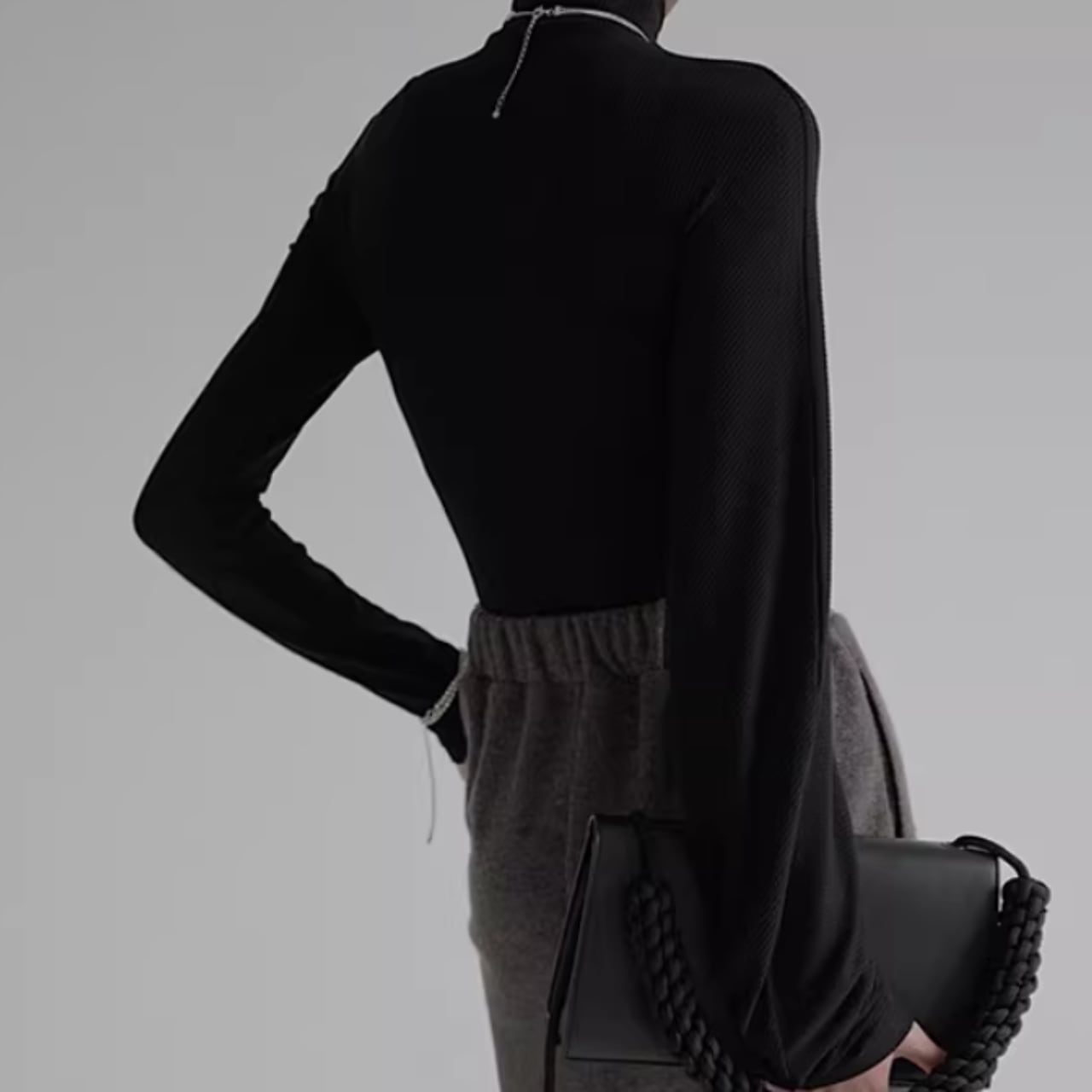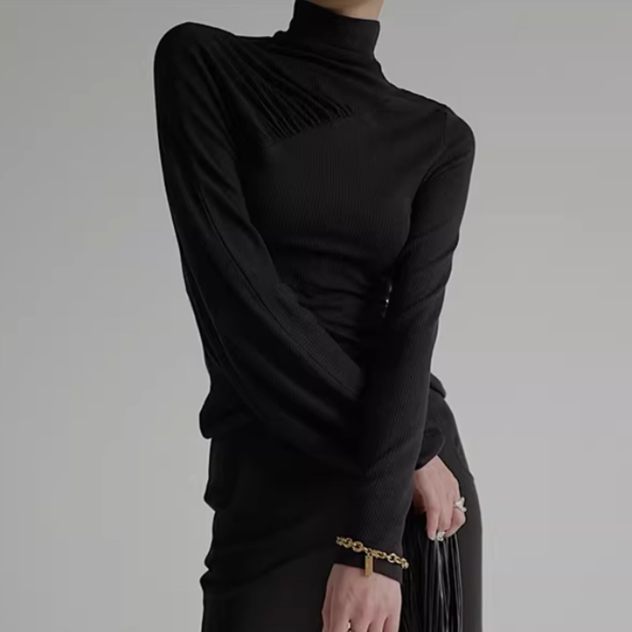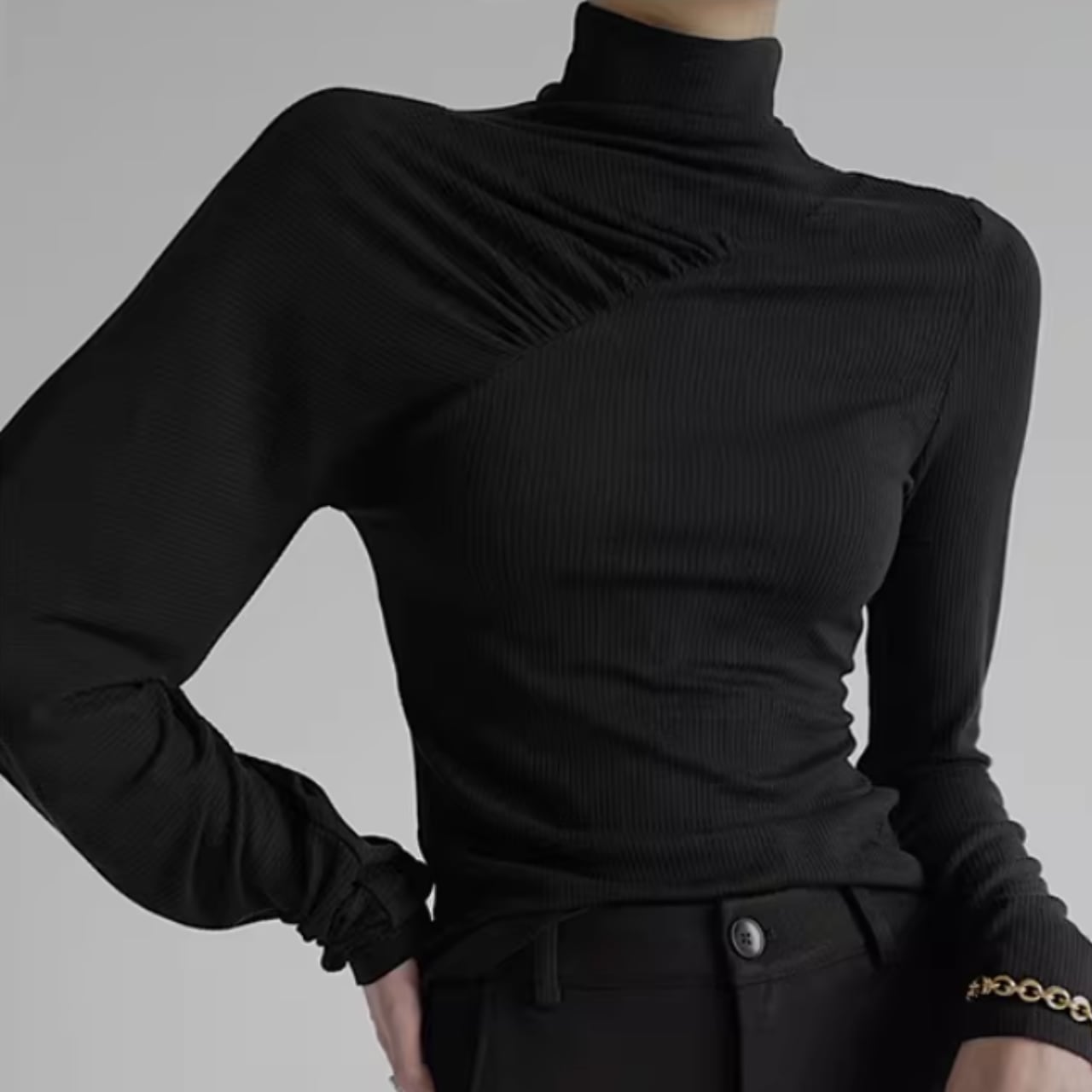 アシンメトリーギャザー タートルネックリブトップス WA0060